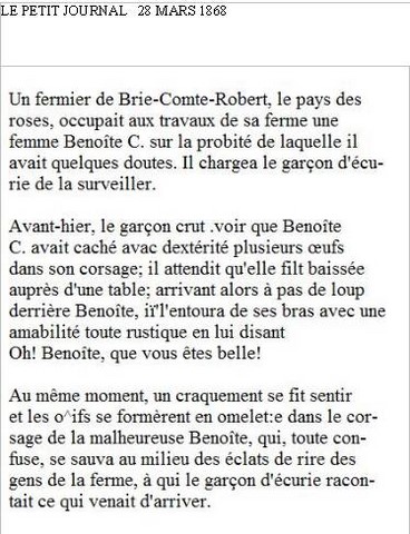 Nicolas Gérard : C'est ça : sur quoi elle me répond d'une jolie voix : comme ça mon brave homme. Vous buvez donc tout seul ? ça n'est pas la mode à Paris. Madame, je lui dis, je ne suis pas de Paris, je suis de Brie Comte Robert, depuis quarante-huit ans que le bon Dieu ma mis dans cette commune ; mais si voulez accepter une goutte d'absinthe avec moi, ainsi que mademoiselle, je suis bon pour vous payer la politesse. Ces dames ayant accepté avec un joli coup d'œil dans les yeux. J'ai tiré mon porte –monnaie ,où il y avait 46 francs et j'ai mis sur le comptoir 30 centimes pour les trois verres d'absinthe. Pendant que nous les buvions , moi et les dames, voilà un grand blond qui rentre et qui dit : Qui est-ce qui paie l'absinthe ici ? je réponds que c'est moi. Alors , qui dit, du moment que ma femme boit avec un paysan, je peux bien en faire autant. Et sur ce coup de temps, il s'a versé une goutte d'absinthe, que j'ai remis 10 centimes sur le comptoir pour faire quitte.