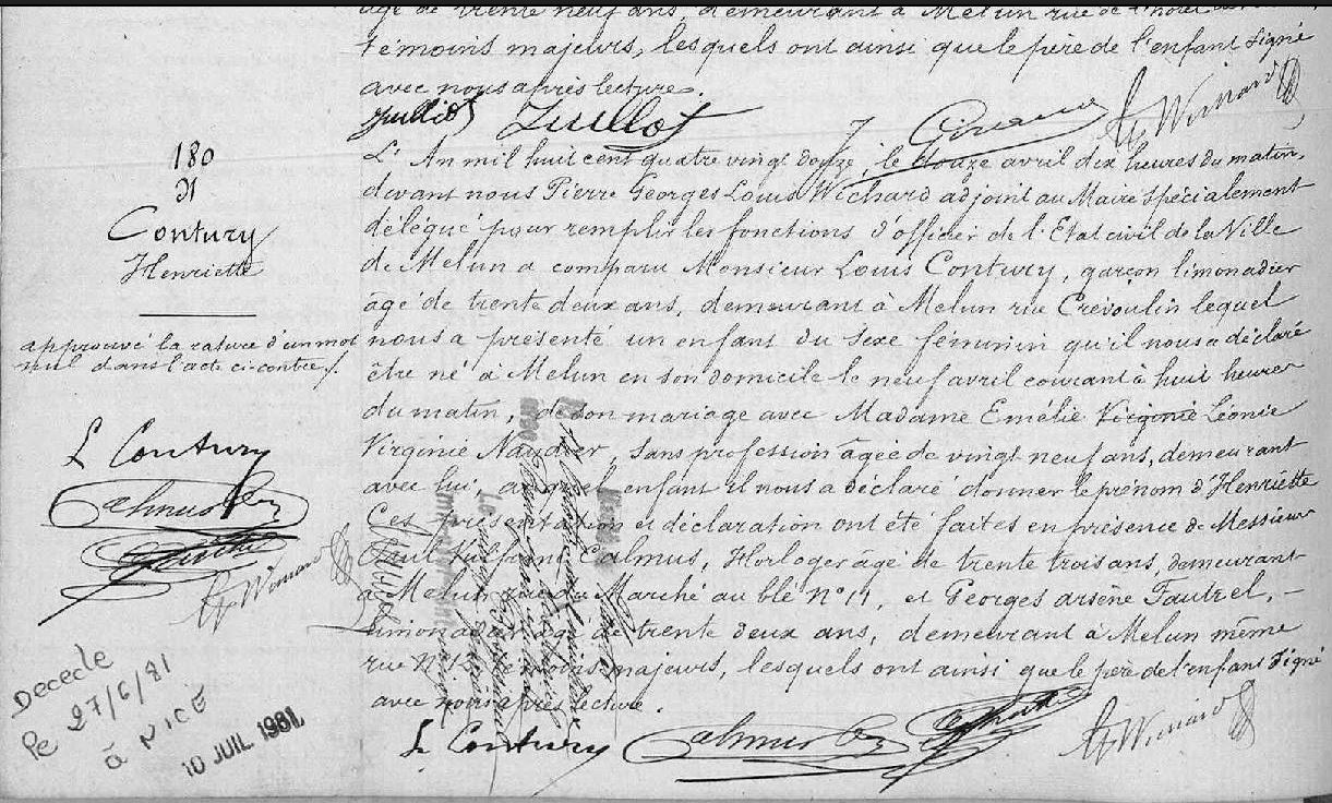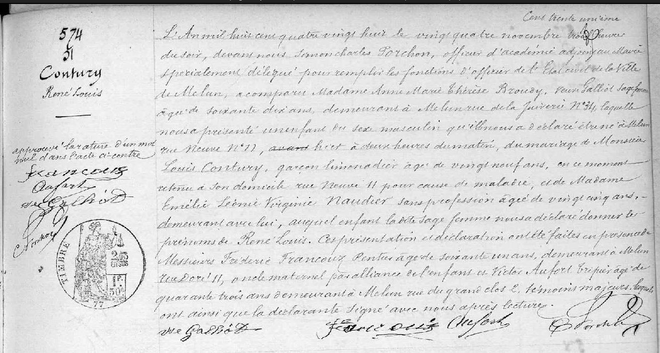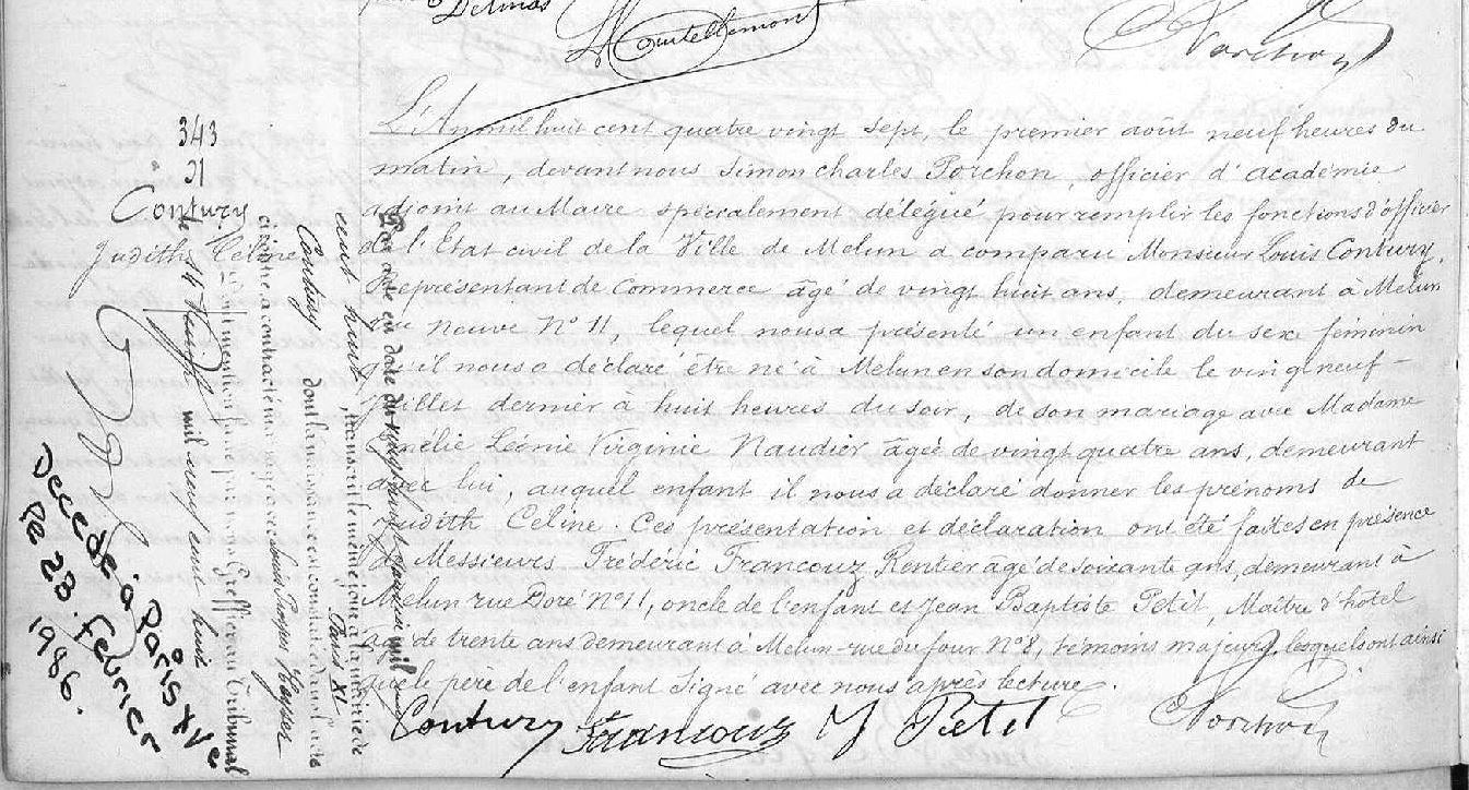 Au domicile de ses parents 5 H.du soir ; témoin 1 : JOLY Alfred, 39 ans ,huissier,Dt BCR 9 rue du Signe de la Croix ; témoin 2 : HURÉ Arthur Gustave, 29 ans,employé,Dt BCR 25 rue de ParisDécès : 1884 à Fontenailles 77370